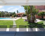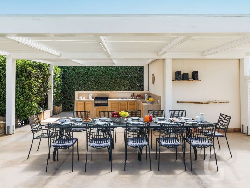 Der Außenbereich ist gepflegt und gut möbliert, hat eine große Sommerküche und einen überdachten Essbereich mit Grill.