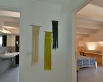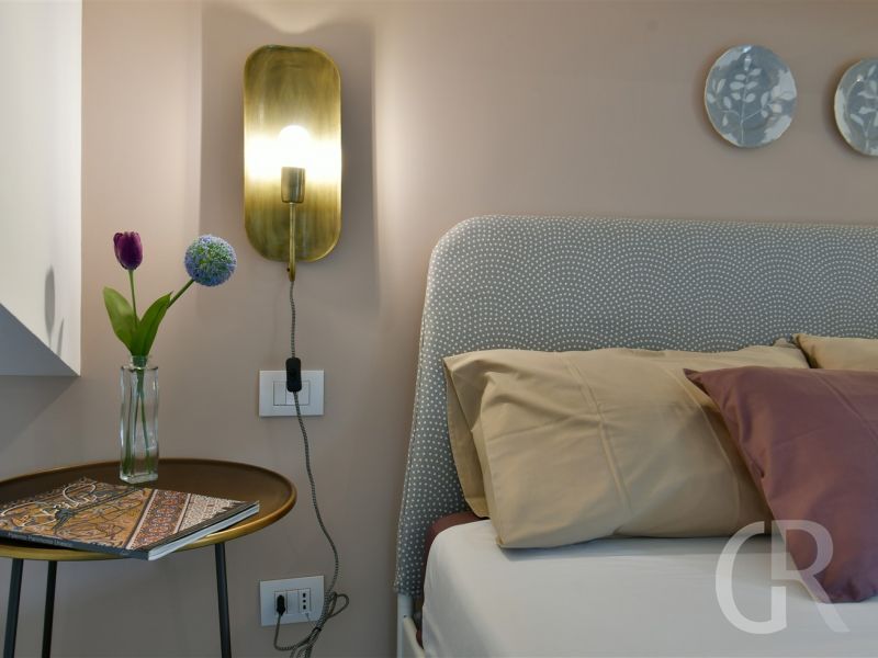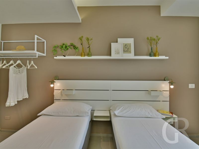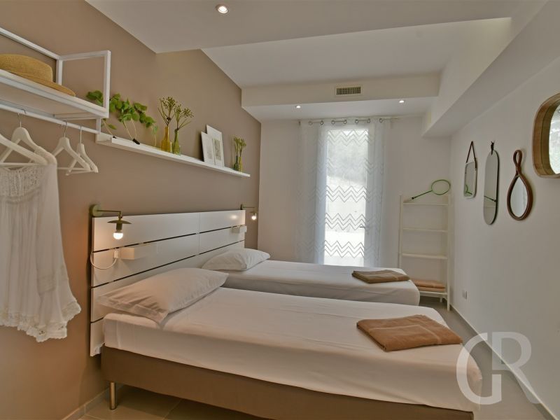 Vom offenen Wohnraum aus gelangt man über eine filigrane Treppe ins Obergeschoss. Dort befinden sich ein Schlafzimmer mit Doppelbett, Einbauschrank, ein Bad mit Dusche und Badewanne, ein Schlafzimmer mit Doppelbett und Einzelbett, ein Schlafzimmer mit Doppelbett und Duschbad. Vom Balkon aus kann man in die schöne Landschaft bis hin zum Meer schauen.